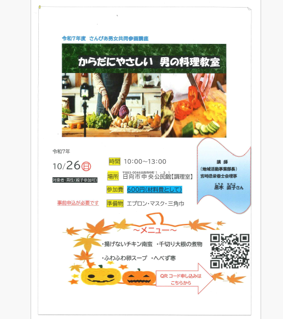令和7年10月26日(日)10:00~13:00 日向市中央公民館調理室でさんぴあ体験型講座